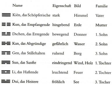 Anzahl der Flächen auf dem Schachbrett - Anzahl der Zeichen im I-Ging. Diese bestehen aus den 8 kombinierten Bildern (des Himmels und der Erde). Diese wiederum sind die 3er Kombination aus einem „Langen Strich“ und einem „gebrochenen Strich“. (aus I-GING, Das Buch der