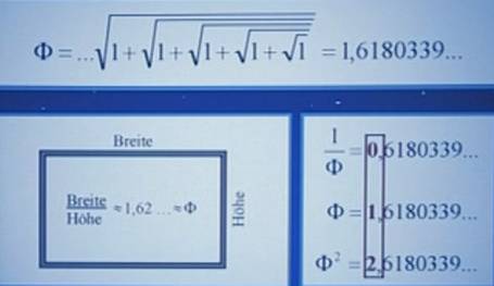 Schnitt: Siehe z.B. http://de.wikipedia.org/wiki/Goldener_Schnitt 0,1,2 : nur mit Phi ist das möglich (Klitzke) Phi-Quotient lässt sich bei allem organischen Körpern der Erde nachweisen, z.B. beim Menschen, Schmetterlingen, Libellen, Fische etc. Weiter sind viele Bauwerke nach dem Goldenen Schnitt (Rechtecke, Spiralen) gebaut. (Melchi). Der Phi-Quotient lässt sich auch aus der Fibonacci-Sequenz herleiten: Die Zahlen der Fibonacci kommen (Spalte 2 = an+2 = an+1 + an) in der Natur sehr oft vor, z.B. Anzahl von Blütenblättern, Anzahl von Spiralen bei Kieferzapfen. (Melchi). Die Fibonacci-Sequenz kann man auch als Spirale darstellen: